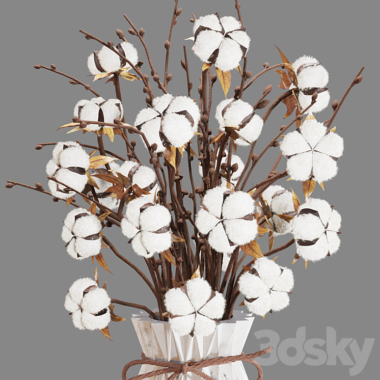 This high-quality 3D model features a cotton flower bouquet in a pleated white marble vase tied with a brown ribbon. The realistic cotton stems and dried leaves add a rustic touch. Three marble-textured candles on a wooden slab with pinecones accompany the vase, creating a warm and inviting ambiance.