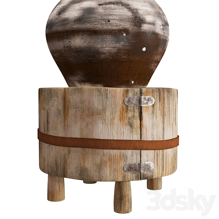 This highly detailed 3D model features a rustic dried bouquet of thin, organically curved branches with small buds, elegantly arranged in a weathered clay vase. The vase rests on a vintage wooden stand made of aged, cracked timber bound with leather and metal clasps, showcasing realistic textures and handcrafted imperfections. The model exudes a Wabi-Sabi charm — celebrating natural simplicity, transience, and imperfection.