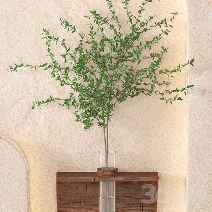 This 3D model captures the essence of minimalist design through a unique wall decor piece featuring a few delicate plant branches held in a glass pot filled with water, attached to a wooden frame mounted on the wall. The glass pot is clear, showcasing the natural beauty of water and branch stems, while the simple wooden frame adds an organic touch, blending both functionality and aesthetic charm. Rendered with high realism using Vray and Corona, the materials are meticulously crafted to emphasize light play on the glass and wood, creating an elegant and clean look.